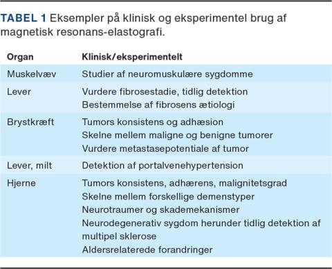 Muligheden for at benytte MRE er interessant i det neurokirurgiske speciale. Tekniske hjælpemidler såsom neuronavigation, operationsmikroskoper og bedre billeddiagnostik har generelt gjort neurokirurgiske indgreb mindre invasive med færre risici. Til trods herfor er der fortsat peroperative forhold, som ikke kan forudsiges. De inkluderer konsistensen af det patologiske væv og dets adhærencer til omkringliggende strukturer. Begge dele har betydning for planlægning og gennemførelse af et operativt indgreb. Målinger af elasticitet giver et nyt indblik i fysiologiske og patologiske tilstande i centralnervesystemet og er af interesse i klinisk og basalvidenskabelig kontekst. Metoden anvendes allerede klinisk til stadieinddeling af leverfibrose og eksperimentelt ved en række andre sygdomme (Tabel 1). Elastografi af hjernen er specielt udfordrende pga. det hårde omkringliggende kranie. MRE-teknologien kan potentielt bidrage til optimering af diagnostik, operationsforberedelse og behandlingsvalg.