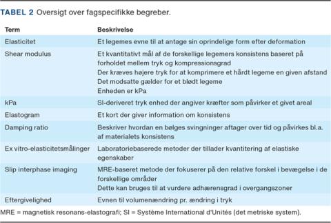 Overordnet består MRE af tre faser [2-4]: 1) Den første fase kaldes mekanisk excitation (Figur 1). Her introduceres tværbølger ind i kraniet typisk ved brug af en vibrerende pude, som er placeret under patientens hoved. Puden vibrerer med en frekvens, som typisk er 60 Hz, hvilket er et kompromis mellem signalstyrke, støj, penetrationsdybe og opløsning [5, 6]. 2) Bølgerne genererer en kompression af vævet, og dermed en deformation. Når der er etableret excitation, tages der fasekontrastbilleder i de forskellige kompressionsfaser. På denne måde kan forskydningen i vævet kodes ind og bølgebillederne genereres. Den bølgegenererede forskydning beskrives med vektorer, der muliggør beskrivelse af position på tværs af billederne [3, 4, 6]. 3) Ved en kompleks post-processering (direkte eller indirekte inversion) af billederne generes et stivhedskort, et elastogram [4]. I elastogrammerne kan en række mekaniske parametre beskrives, herunder shear modulus (kPa) og damping ratio,der begge siger noget om konsistensen af vævet (Tabel 2). De målte værdier er afhængige af både vævets egenskaber og de måletekniske metoder. Pga. stor variation i sidstnævnte er sammenligning på tværs af studier svær at foretage på nuværende tidspunkt. Totalt tager det ca. syv minutter at optage billederne. Post-processering sker i dag manuelt, men det forventes, at der udvikles automatiske løsninger som dem, der findes for leverelastografi. Udstyret koster 13.000-40.000 euro afhængig af leverandør.