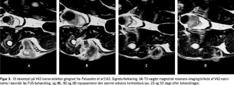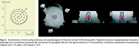 Formålet med denne oversigtsartikel er at gennemgå nyere metodologisk udvikling, klinisk vigtige eksperimenter og kliniske studier frem til i dag inden for MR-guided FUS. Denne teknologi bliver for øjeblikket kun udført på ganske få labo-ratorier i verden, herunder af forskergruppen ledet af Dr. Moonen i Bordeaux, Frankrig, som har kunnet udvise markante metodologiske fremskridt i realtidstemperaturkontrol samt ensartet og hurtig behandling af store vævsområder. En anden betydningsfuld forskergruppe ledet af Dr. Hynyen i Boston, USA, har for nylig rapporteret dels om muligheden for at anvende teknikken i hjernen, dels om de første kliniske behandlingsstudier af godartede tumorer i bryst og livmoder.