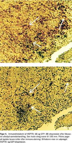 Guilhon et al har netop vist en præcis kontrol af transgenekspression både tidsligt og rumligt, baseret på en veldefineret hypertermi, der er genereret med MRI-styret FUS-behandling [6, 17]. Ekspression af det grønt fluorescerende protein (GFP)-markørgen blev anvendt i dette studium. To cellelinjer blev udvundet af G6-gliomaceller. GFP-ekspressionen i den første blev kontrolleret af CMV-promotoren, mens den i den anden blev kontrolleret af HSP70-promotoren og dermed kunne aktiveres af varme. Subkutane tumorer blev dyrket ved injektion i immunodefekte mus og rotter. Tumorerne blev derefter udsat for temperaturer i intervallet 42-50°C (3-25 minutter) kontrolleret af det kombinerede MRI-FUS-system [12]. Hi-stologiske analyser blev udført 24 timer efter varmebehand-lingen parallelt med undersøgelse af endogen HSP70-ekspressionen og C6-cellefordelingen. Dette interessante studium viste en udtalt ekspression ved 50°C anvendt i korte perioder (3 minutter), uden at cellernes levedygtighed blev påvirket (Figur 4 ). Ligeledes blev induceret ekspression observeret ved temperaturer på 44-48°C, men ikke ved en temperaturer på 42°C.