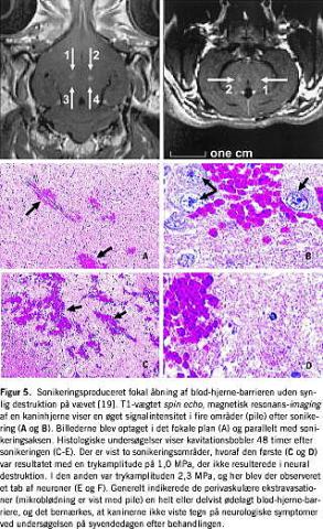 Mange sygdomme i centralnervesystemet er svære at behandle, fordi medikamenter baseret på store molekyler ikke kan passere gennem blod-hjerne-barrieren [18]. Hynynen et al har rapporteret om en reproducerbar, konsistent og lokaliseret åbning af blod-hjerne-barrieren uden klare tegn på permanente skader på hjernevævet efter påvirkning med FUS [19]. I et studium blev et stykke kranium (20 × 20 mm) fjernet på en serie af 18 kaniner, hvorefter huden blev fæstnet over kranieåbningen igen. Et ultrasonografisk kontraststof (UCA) blev injiceret intravenøst ca. 10 sekunder før hver ultralydeksponering. Bemærk at laveffekt-FUS er tilstrækkelig til at forårsage kollaps af mikrobobler i UCA-gas i fokuspunktet, hvilket resulterer i kavitationsregioner med et deraf følgende lokali-seret mekanisk stress. Temperaturovervågning med online MRI-termometri indikerede i dette studium en maksimal temperaturstigning på 5°C i løbet af ultralydeksponeringen (20 s), hvorunder termiske effekter var negligeable. Efter FUS-behandlingen blev der optaget T1-vægtede MRI-billeder før og efter intravenøs injektion af en bolus af et paramagnetisk kontraststof med en molekylvægt på 928 Dalton for at påvise en åbning af blod-hjerne-barrieren. Det blev desuden bemærket, at ændringer af signalintensiteten på de T1-vægtede MRI-billeder forårsaget af kontrastvæske, der lækkede gennem blod-hjerne-barrieren, afhang af den anvendte FUS-effekt. Ændringen i signalintensitet var størst umiddelbart efter ultralydeksponeringen og faldt igen efter få timer. Det laveste ultralydtryk, der kunne producere en åbning af blod-hjerne-barrieren, var mindre end 0,8 mPa. Ligeledes blev det påvist, at ultralydbehandlingen i de fleste tilfælde forårsagede en lokal åbning af blod-hjerne-barrieren uden nogen påviselig skade på det omkringliggende væv (Figur 5 ).