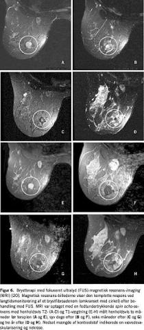 Det første feasibility -studium af MRI-kontrolleret fokuseret ultralydkirurgi af benign fibroadenomer i brystet blev rapporteret i 2001 [20]. Fibroadenomer blev af Hynenen et al valgt til disse første onkologiske patientundersøgelser med d enne teknik, eftersom denne type benigne tumorer er klart afgrænsede og let kan skelnes fra normalt brystvæv på såvel T2- som kontraststofforstærkede T1-vægtede MRI-billeder [21]. Et andet vigtigt aspekt var, at lokal anæstesi og lav medicinering til mild bedøvelse var tilstrækkelig for denne noninvasive procedure. Varigheden af hver ultralydpuls var ti sekunder. Hviletiden mellem gentagne pulser var generelt 50 sekunder, og en enkelt behandlingssession omfattede 25-106 pulser (afhængig af tumorstørrelse). De ablaterede områder var tætpakket med en indbyrdes afstand i behandlingsplanet på 2,8 mm. Eksempelvis var behandlingstiden for en 2 cm stor læsion cirka to timer. MRI-termometri blev udført simultant med hver ultralydspuls for både at overvåge fokuspunktets placering og temperaturudviklingen i det behandlede område. På baggrund af kontraststofforstærkede T1-vægtede MRI-billeder kunne 73% af alle læsioner konstateres at være delvist eller fundstændigt behandlet. En samling langsigtede opfølgende billeder er vist på Figur 6 . Fibroadenomerne i den øverste del af det venstre bryst blev behandlet i løbet af en 75 minutter lang session. Omkringliggende ødemer var synlige til og med to dage efter behandlingen. Der var der ingen tegn på øget celleaktivitet i op til tre år efter behandlingsforløbet verificeret med kontraststofbaseret MRI. Efter tre år var læsionen kun synlig som et lille hypointenst område af nedsat signalintensitet på ikkeforstærkede T1-vægtede MRI-billeder, hvilket indikerede, at tumoren ikke var reetableret.