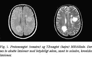 Akutte og kroniske MS-læsioner er hyperintense på T2-vægtede og protonvægtede billeder (Fig. 1). Det samme er tilfældet for de fleste andre patologiske forandringer som for eksempel inflammatoriske, infektiøse eller neoplastiske forandringer. Hyperintensiteten skyldes blandt andet øget vandindhold, hvilket ses ved både ødem, demyelinisering, remyelinisering, gliose og axontab.