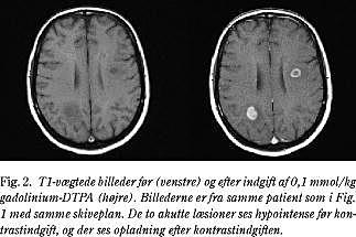 Effekten af kontrast ses som signalforstærkning på T1-vægtede billeder (Fig. 2). Da gadolinium-DTPA ikke trænger igennem den intakte blod-hjerne-barriere, markerer opladning øget blod-hjernebarriere-permeabilitet, hvilket ses ved inflammation. Dette anses for at være et af de første trin i udviklingen af en MS-læsion (6). Opladningen persisterer omtrent 1 måned for herefter at forsvinde. Gadoliniumopladning har stor sensitivitet for akutte læsioner og er et simpelt mål for sygdomsaktivitet ved MS. Månedlig MR-scanning med kontrast afslører ti gange så mange nye opladende læsioner som kliniske attakker hos patienter med attakvis og sekundær progressiv MS (17).