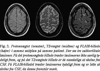 Ved FLAIR (fluid-attenuated inversion recovery) undertrykkes signalet fra CSF, hvilket letter visualiseringen af læsioner på overgangen mellem CSF og hjerne (Fig. 3). Kortikale, subkortikale og periventrikulære læsioner samt læsioner svarende til corpus callosum ses således tydeligere (3, 6). Desværre er FLAIR-sekvenserne oftest mindre sensitive end T2-vægtede og protonvægtede billeder til påvisning af infratentorielle læsioner, hvorfor metoden ikke rutinemæssigt bør anvendes alene (3).