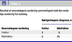 Resultater: Reservelægerne fandt tre ud fem scaphoideum-frakturer og fejlfortolkede seks. Der opnåedes en negativ prædiktiv værdi på 97% og en positiv prædiktiv værdi på 33%. Specificiteten og sensitiviteten var på 92,5% og 60%. Reservelægerne og radiologen fandt 11 distale radiusfrakturer, som ikke kunne ses primært.