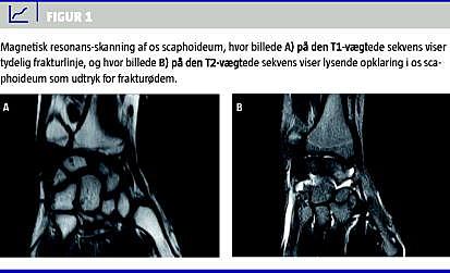 Scaphoideum-frakturer udgør 60% af frakturerne i håndroden [1]. Guldstandarden for diagnostik af scaphoideum-frakturer er magnetisk resonans (MR)-skanning af håndleddet [3-6]. Denne modalitet er oftest ikke er tilgængelig i forbindelse med den primære vurdering af patienterne i skadestuen, hvorfor der primært udføres røntgenundersøgelse med specialoptagelser af scaphoideum. Undersøgelser har dog vist, at 6-16% af de primære røntgenoptagelser er falsk negative, og man kan derved ikke udelukke scaphoideum-fraktur alene ved røntgenundersøgelse [2, 4]. Påvises der ikke scaphoideum-fraktur ved den primære røntgenundersøgelse, anlægges der derfor på de fleste skadestuer en »scaphoideum obs. pro-gipsskinne«. Derefter kommer patienterne 10-14 dage senere til en ambulant kontrol, hvor der tages et nyt røntgenbillede. Hvis der ikke påvises fraktur ved denne røntgenundersøgelse, og der fortsat er klinisk mistanke om scaphoideum-fraktur, anbefales MR-skanning.