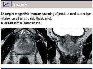 Højopløselige T2-vægtede (T2W)-billeder i tre planer har vist sig at være yderst velegnede til cancerdiagnostik, da man ved tynde snit kan opnå et godt overblik over prostatas zonale anatomi. Den normale periferizone ses som en lysere homogen zone med øget signalintensitet, mens transitionszonen har en mere heterogen intermediær signalintensitet, der typisk er præget af hyperplastiske runde benigne noduli (BPH). Cancerforandringer på T2W-billeder viser sig typisk som hypodense mørke homogene foci (Figur 1). Kapslen ses som en mørk, tynd bræmme med lavt signal rundt om periferizonen, og det er derfor nødvendigt med så høj spatialopløsning som muligt, hvis man skal vurdere eventuelle tegn på ekstrakapsulær tumorvækst. Såfremt tegn på minimal ekstrakapsulær vækst er afgørende for behandlingsvalget, anbefales det at bruge rektalspole for at opnå så høj spatialopløsning som muligt.