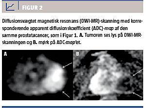 Diffusionsvægtet (DWI)-skanning er en noninvasiv funktionel MR-teknik, der reagerer på ændringer i vandmolekylers diffusion gennem væv pga. mikroskopiske strukturelle forandringer. Prostatacancervæv har generelt større celletæthed og mere hæmmet diffusion end det normale glandulære væv, hvilket ses som lyse områder på DWI-billeder (Figur 2). Nedsat diffusion giver tilsvarende lavere udregnede ADC-værdier, der afspejler sig som mørke områder på ADC-map’et. DWI-billeder og ADC-map kan således være til hjælp i differentieringen mellem malignt og benignt prostatavæv. Helt nye studier tyder desuden på, at den relative ændring i vævets diffusion, der er angivet på ADC-map’et, er korreleret til den histologiske Gleasonscore [9]. Da Gleasonscoren er et mål for tumorens aggressivitet, kan ADC-map’et således potentielt bruges som et noninvasivt mål herfor. Brug af DWI sammen med T2W øger især MR-undersøgelsens specificitet [10].