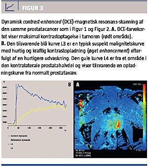 Tumorer udviser typisk en hurtigere og kraftigere kontrastopladning (øget enhancement) efterfulgt af en hurtigere udvaskning af kontrasten (Figur 3). DCE-MR-skanning kræver både høj spatial og høj temporal opløsning, da andre benigne tilstande i prostata, såsom BPH og prostatitis, også kan give patologisk opladning på DCE-MR-billeder [11]. Derfor analyseres DCE-MR-billeder bedst i sammenhæng med de øvrige mMR–teknikker, for at man kan opnå bedst mulig sensitivitet og specificitet. Brugen af DCE-MR-skanning øger især mMR-undersøgelsens sensitivitet [10].