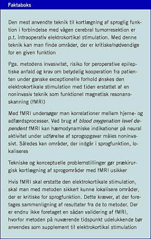 Kortlægning af sprogfunktion ved brug af fMRI bliver dog beskrevet som problematisk i litteraturen. Der hersker ikke konsensus om den optimale fremgangsmåde, og der er til formålet benyttet et utal af forskellige sprogopgaver med et lige så varieret billede af resultater. Betydelige forskelle i registrerede aktiveringer rapporteres både inter- og intrasubjektivt (på tværs af sessioner) [1]. Identifikation af patientens sprogdominante hemisfære ved brug af fMRI vurderes i litteraturen at korrelere udmærket med resultater fra Wada-testen, typisk med en overensstemmelse på 91-95% [2]. I Wada-testen bedøves hemisfærerne selektivt, idet der unilateralt indsprøjtes amobarbital i arteria carotis interna, så stoffet føres med blodstrømmen til den ipsilaterale hemisfære. Ud fra patientens evne til at udføre diverse sprogopgaver under bedøvelse af henholdsvis venstre og højre hjernehalvdel kan den sprogdominante hemisfære findes. Præcis lokalisering af sprogområder i den enkelte hemisfære er dog et spørgsmål af stor kirurgisk interesse. Resultater fra fMRI og elektrokortikal stimulation stemmer generelt, men ikke komplet, overens på dette niveau, idet de to metoder giver forskellig information. Diskrepansen består i, at den peroperative kortlægning afslører områder, der er kritiske for sprogfunktion, mens fMRI afslører områder, der indgår i, men ikke nødvendigvis er kritiske for denne funktion [3, 4]. fMRI afslører derfor typisk flere områder, end den elektrokortikale stimulation gør. Den ideelle målsætning er, at fMRI sikkert kan afsløre samtlige områder, der er kritiske for sprogfunktionen. Den praktiske udførelse kan illustreres med eksempler fra Glostrup Hospital, hvor der som et af de første steder i Danmark p.t. gøres nogle indledende kliniske erfaringer på området.