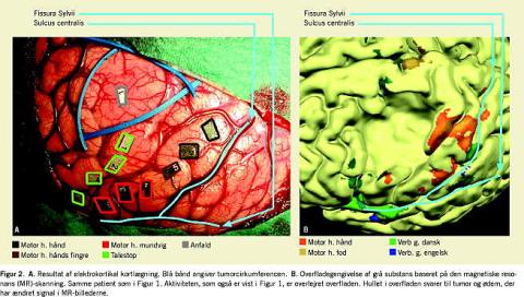 fMRI-billederne efterbehandles statistisk og billedmæssigt med softwarepakken Brain Voyager. Et eksempel på resultatet af skanning af en patient, der har gennemført verb generation og flere motoriske opgaver, fremgår af Figur 1 . Inden operationen debatteres resultatet ved en tværfaglig konference med en neurokirurg, en neuropsykolog og en MR-læge/fysiker. Validering af et fMRI-paradigme til prækirurgisk kortlægning af sprogfunktion forudsætter, at kritiske regioner - afsløret med stimulation under operationen - gennemgående kan lokaliseres med fMRI inden operationen. Kombinationen af præoperativ fMRI og peroperativ sprogkortlægning er en unik mulighed for at undersøge dette forhold. Figur 2 illustrerer en sammenligning af data fra de to metoder. Der er publiceret et begrænset antal undersøgelser, hvori man foretager en sådan sammenligning [5, 6]. I den kliniske anvendelse af fMRI til prækirurgisk planlægning er det vores foreløbige konklusion, at teknikken kan supplere den elektrokortikale stimulation og neuropsykologiske peroperative testning ved præoperativt at lokalisere den sprogdominante hemisfære og forberede neurokirurgen på evt. kritisk nærhed mellem tumoren og funktionelle områder. Nogle forfattere påpeger endvidere, at resultatet af funktionel billeddannelse kan guide placeringen af elektroder under stimulationen og dermed nedsætte operationstiden [7]. Dette er der dog ikke enighed om blandt neurokirurger.