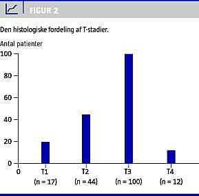 De resterende 173 patienter udgør materialet og består af 98 mænd og 75 kvinder med en medianalder på 71 år (spredning: 34-91 år). Den histologiske for-deling af T-stadier ses af Figur 2 .
