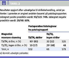 Materiale og metoder: Retrospektiv opgørelse af MR-skanninger fra 173 patienter (98 mænd og 75 kvinder, medianalder 71 år), der var opereret for rektumcancer på Hvidovre Hospital i perioden 2002-2005. MR-skanningens T-stadium blev sammenlignet med det histologiske T-stadium af tumorresektatet (pT).