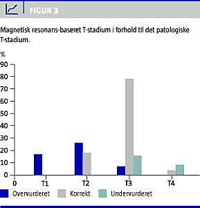 Af vores resultater ses, at især overvurdering af T2 tumorer (59%, n = 26) er et problem, som medfører en overflødig præoperativ strålebehandling med deraf følgende bivirkninger. I dette studium kan en del af overvurderingen forklares med beslutningen om at klassificere bløddelsstrøg i mesorektum på MR-skanningen som udtryk for tumorvækst, idet det er et velkendt problem, at inflammatoriske forandringer og/eller desmoplastisk reaktion omkring tumor kan være svære at skelne fra tumorvækst [9]. Tilsvarende ses en lavere forekomst af undervurderede T3-tumo-rer (15%, n = 15), som atter kan forklares med, at alle skanninger med forandringer i mesorektum er klassificeret som T3. Nøjagtigheden af MR-skanning ved T3-tumorer er 78%, hvilket delvist kan forklares med den høje forekomst af T3-tumorer i vores materiale (58%, n = 100).