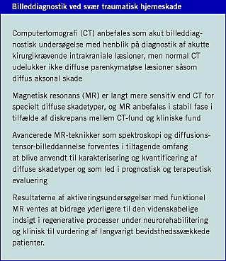 Metoder til bedømmelse af den individuelle prognose efter svær traumatisk hjerneskade savnes. Der er stærk klinisk evidens for, at sekundære hypoksisk-iskæmiske skader har markant prognostisk indflydelse, og kortlægning af primære og sekundære skadeelementer er derfor væsentlig ved bedømmelse af den individuelle prognose. MR-skanning efter svært kranietraume, med fordel foretaget i den subakutte fase, muliggør langt mere nøjagtig læsionsdiagnostik end CT. Supplerende kvantitative MR-metoder som spektroskopi og diffusionstensor-billeddannelse rummer potentielt prognostisk information, og disse metoder forventes i tiltagende grad implementeret fremover. Aktiveringsundersøgelser med funktionel MR har særlige perspektiver for bedømmelse af langvarigt bevidsthedssvækkede patienter. Endelig er det sandsynligt, at flere af disse MR-metoder kan anvendes som led i evaluering af farmakologiske og nonfarmakologiske behandlingstiltag.