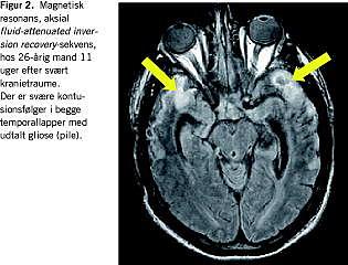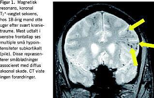 I en række studier med kranietraumepatienter udført med single voxel MRS i hjerneområder uden fokale skader har man bl.a. fundet reduktion af N-acetylaspartat og forhøjelse af kolin, hvilket menes at være udtryk for henholdsvis neuronskade og membrannedbrydning eller gliose [8]. Hos komatøse traumepatienter har Danielsen [8, 9] fundet, at metaboliske forandringer overvejende i hvid substans indikerer DAI, mens påvirkning af grå substansspektre kan være udtryk for hypoksisk vævsskade. Mulighed for differentiering mellem primær DAI og sekundær hypoksisk og/eller iskæmisk skade har afgørende prognostisk værdi, idet det i større kliniske opgørelser ses, at en sekundær skadekomponent forringer prognosen efter kranietraume med op til en faktor ti [7]. MRS er implementeret til klinisk brug enkelte steder i landet.