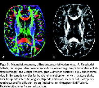 Ved diffusionsvægtet MR afbildes den regionale vanddiffusion i hjernevævet. Diffusiviteten kan udtrykkes kvantitativt som den tilsyneladende diffusionskoefficient, der er øget ved vasogent ødem og reduceret ved cytotoksisk ødem. Ved en videreudvikling af diffusionsvægtet MR, benævnt diffusionstensor-billeddannelse, kan man kvantificere vævets retningsspecifikke vanddiffusion, der udtrykkes ved den fraktionelle anisotropi. Idet vand i højere grad diffunderer langs med aksonernes fiberretning end på tværs af denne, vil der hos raske findes høje værdier for fraktionel anisotropi i hvid substans-strukturer med overvejende parallelle fiberbundter, som f.eks. den midtsaggitale del af corpus callosum. Ved DAI forstyrres netop den aksonale mikroarkitektur, og den fraktionelle anisotropi reduceres følgelig [4, 5] (Figur 3 ). Som ovenfor nævnt underestimeres omfanget af DAI ved konventionel MR, fordi læsionerne er mikroskopiske og derfor kun synlige ved større samlede læsioner eller ved ledsagende hæmoragi. Foreløbige resultater tyder på, at den fraktionelle anisotropi eksempe lvis i corpus callosum kan anvendes som et kvantitativt estimat af det reelle omfang af DAI [4, 5]. Hvorvidt denne parameter kan anvendes som markør for prognosen på længere sigt, afventer nærmere undersøgelser.
