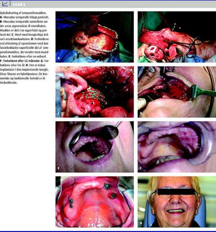 Rekonstruktionen kan illustreres ved følgende patienthistorie: en 64-årig kvinde med karcinom på processus alveolaris superiors venstre side med ossøs indvækst. Figur 1 viser defekten efter kirurgisk ablation, den frilagte musculus temporalis samt transponering til mundhulen og den sagittale deling i en profund og superficiel del. Den profunde del af musklen anvendes som aflukke mod næsekavitet og mod bihule og orbita. Herefter appliceres ved kæbekirurg knoglechips i en præformeret mesh, der fikseres til den resterende del af zygoma samt den kontralaterale maksil. Figuren viser denne procedure, der afsluttes med aflukning mod mundhulen ved anvendelse af det superficielle muskelblad, idet den fasciebeklædte del af musklen vendes ind mod mundhulen. I løbet af ca. fire uger vil musklen epitelialisere. Figuren viser resultatet efter henholdsvis en måned, 12 måneder og fire år. De indsatte transplantater fikserer en fuld overkæbeprotese.