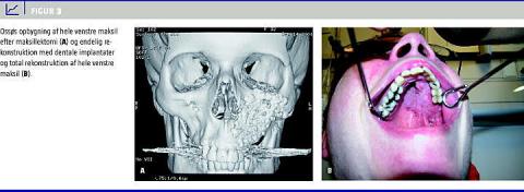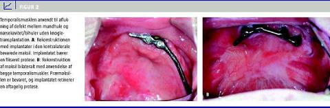 Ved yngre patienter med betanding er det ønskeligt af hensyn til dentitionen at foretage ossøs rekonstruktion. Dette kan gøres primært ved at ilægge knoglechips mellem de to vitale muskelblade fra temporalismusklen. Det er også muligt at transplantere knogle sekundært, efter at temporalismusklen er indhelet og epitelialiseret, idet man da løsner musklen perifert og osteosynterer knogle under den velvaskulariserede muskel. Figur 3 viser resultatet hos en ung patient, der har fået foretaget hemimaksillektomi og har gennemgået rekonstruktion med knogle og temporalislap samt efterfølgende dentale implantater.