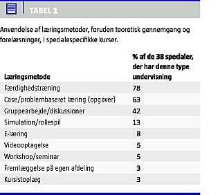 I alle specialer var teoretisk gennemgang/forelæsning anført som en del af undervisningen. Øvrige læringsmetoder blev kategoriseret i følgende grupper: case/problembaseret læring (PBL) (opgaver), workshop/seminar, færdighedstræning/praktiske øvelser (inklusive kirurgisk teknik), simulation/rollespil, videooptagelse af konsultation, gruppearbejde/gruppediskussioner, e-læring, fremlæggelse af teoretisk viden i egen afdeling og kursistoplæg.
