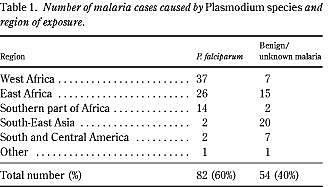 I alt 136 tilfælde af malaria blev diagnosticeret på Fyn i perioden 1987-1999. Kønsratio var 89/47, median alder 32 år (spredning 2-59). Af de 136 var 99 (73%) etniske danskere, 28 (21%) var af afrikansk oprindelse, 9 (6%) var fra Asien. De ikke-etniske danskere er opdelt i indvandrere og gæster på kortvarigt ophold. Forekomsten af malariatilfælde er stigende over tid, men andelen af Plasmodium falciparum-malaria er ikke signifikant forskellig i perioderne 1987-1992 og 1993-1999, median 3 (spredning 2-9) mod median 7 (spredning 4-11) (p=0,35, Fishers eksakte test). Tres procent af tilfældene var forårsaget af Plasmodium falciparum, 28% af P. vivax, 6% af P. ovale og 1% af P. malariae. I seks tilfælde (4%) kunne malariatypen ikke klassificeres. Som det fremgår af Tabel 1 var der store geografiske forskelle for de enkelte Plasmodium species. Således var 77 af 82 tilfælde (94%) af P. falciparum-malaria erhvervet i Afrika, mens det kun gjaldt for ca. en fjerdedel af P. vivax-tilfældene. Halvdelen af sidstnævnte (19/38) var erhvervet i Sydøstasien eller på det indiske subkontinent. Næsten tre fjerdedele (101/136) af tilfældene hos såvel danske stats borgere som immigranter og korttidsgæster var erhvervet under ophold i Afrika.