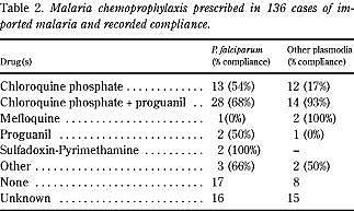 18% af patienter oplyste, at de ikke havde anvendt nogen form for kemoprofylakse, mens der manglede oplysninger i 23% af tilfældene. Cirka 58% havde således taget kemoprofylaktika under en eller anden form. Seksoghalvfjerds procent (75/99) af danskerne mod kun 31% (4/13) immigranter på besøg i hjemlandet havde påbegyndt malariaprofylakse forud for rejsen. Kun en af 24 korttidsbesøgende havde havde anvendt nogen form for profylakse. Tabel 2 viser arten af kemoprofylakse og den registrerede komplians sammenholdt med Plasmodium species. Af de 41 patienter med P. falciparum-malaria, som angav at have taget enten chloroquin eller chloroquin + proguanil havde kun 24 (59%) med sikkerhed taget profylaktika efter forskriften, ti (24%) havde med sikkerhed ikke fulgt rekommandationerne, og hos syv (17%) var oplysningerne usikre. Komplians i den gruppe, der havde taget chloroquin + proguanil (n=42) var 76%, men kun 36% i den gruppe, der havde taget chloroquin alene (n=25). Kun tre patienter angav at have taget mefloquin som profylaktikum. To med non-P. falciparum angav komplians, mens én patient med P. falciparum-malaria kun havde taget profylaktika i en del af ekspositionsperioden.