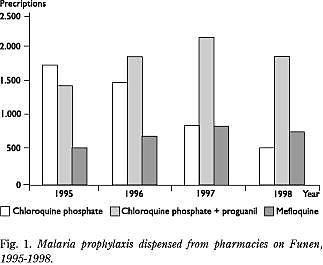 De tilgængelige data fra OPED-databasen og fra Fyns Amts Sundhedssekretariat fremgår af Fig. 1. Antallet af personer, der har fået udskrevet chloroquin alene, er faldet til fordel for en kombination af chloroquin og proguanil eller mefloquin. Malarone blev først introduceret til profylakse i 1998 og figurerer derfor ikke på opgørelsen. Chloroquin som eneste profylaktikum faldt fra 1995 til 1998 fra 47% til 17%. I samme tidsrum steg andelen af profylakse med chloroquin kombineret med proguanil fra 39% til 58%, og mefloquins andel fra 15% til 25%.