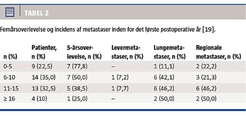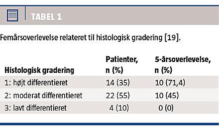 I litteraturen varierede femårsoverlevelsen fra 31% til 60% [7, 12]. Grad 2-3 spredte sig hurtigere end grad 1, recidiverede oftere og var forbundet med nedsat overlevelse (Tabel 1) [8, 14, 19]. Tumorstørrelsen var ligefrem proportional med risikoen for metastaser og omvendt proportional med overlevelsen (Tabel 2) [6, 7, 12, 13, 18, 19].