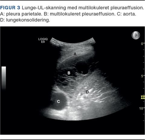 Hos patienter med multilokuleret pleuraeffusion, dvs. mange lommedannelser pga. intrapleurale septae (Figur 3), kan udtømning af pleuravæske være en udfordring. Hos udvalgte patienter kan intrapleural behandling med fibrinolyse (alteplase) og DNAse (dornase alfa) indgivet gennem IPC eller vanligt pleuradræn anvendes til opløsning af septae [23, 24]. Denne behandling bør varetages på specialiserede lungemedicinske afdelinger. Der gives typisk to behandlinger dagligt i tre dage, som ved empyem. Smerter og blødning er de alvorligste bivirkninger (hhv. ca. 12% og 4%) [23, 25]. Der er ikke evidens for, at fibrinolyse forud for pleurodese øger antallet af succesfulde pleurodeser [26].