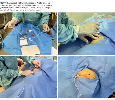 Tunneleret dræn (indwelling pleural catherter (IPC)) er et specialdesignet, tunneleret silikonekateter med en muffe, der vokser fast i underhuden. Begrebet permanent dræn bruges ofte, men IPC er ikke mere permanent, end at det kan og skal fjernes, hvis det ikke behøves længere. IPC giver mulighed for hyppige, gentagne udtømninger af pleuravæsken i eget hjem ved en hjemmesygeplejerske, pårørende eller patienten selv (Figur 2). Patienten slipper hermed for jævnlige, ambulante pleuracenteser i sygehusregi og længerevarende hospitalsophold til pleurodesebehandling.