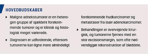 MA i forhold til deres morfologiske differentiering i tre grupper: 1) apokrine-ekkrine, 2) sebaceøse og 3) follikulære [1]. MA opstår oftest de novo eller sjældnere gennem malign transformation fra en benign adnekstumor. Eftersom MA forekommer sjældent og kan ligne de benigne adnekstumorer, de almindeligt forekommende hudkarcinomer (basocellulært karcinom og planocellulært karcinom) og metastaser fra adenokarcinomer kan det være udfordrende at stille den rigtige diagnose [2, 3]. Formålet med denne artikel er at øge kendskabet til MA mhp. korrekt diagnostik, udredning, visitation og behandling. MA er sjældne sygdomme, og prognosen afhænger af korrekt diagnostik og behandling.
