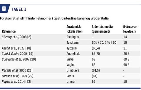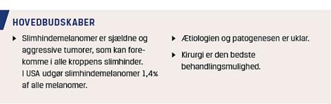 Melanomer opstår sjældent i slimhinder [1]. Primære slimhindemelanomer (SM) dannes i melanocytter, som er placeret i organernes slimhinder, i gastrointestinalkanalen, urogenitalkanalen og hoved-hals-regionen. Femårsoverlevelsen for patienter med SM er blot 25% [2, 3]. Formålet med denne artikel er at gennemgå den nyeste viden inden for ætiologi, patogenese og behandling af maligne melanomer, der udvikler sig i gastrointestinale og urogenitale organers slimhinder.