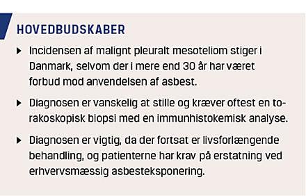 MPM er en diagnostisk udfordring, hvor torakoskopisk biopsi og immunhistokemiske analyser ofte skal foretages, før diagnosen kan stilles. I den daglige klinik skal der være opmærksomhed på dette, så patienterne hurtigt får en korrekt diagnose og behandling. Erhvervsmæssig asbesteksponering er derfor en vigtig del af