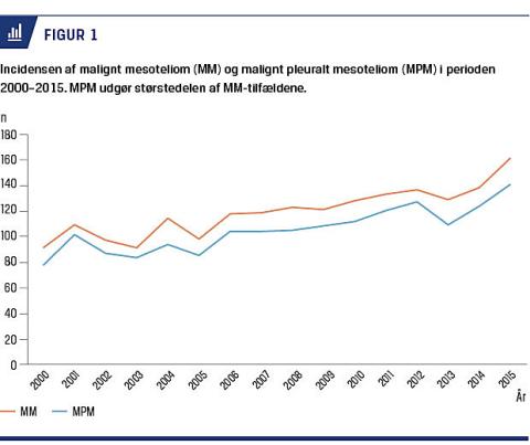 Incidensen af MM har været stigende i Danmark siden opdagelsen af sammenhængen mellem asbesteksponering og udviklingen af cancer, hvilket skyldes den lange latenstid, som varierer fra 15 år til 70 år [1, 4]. Der diagnosticeres godt 100 tilfælde om året i Danmark (Figur 1) [6]. Incidensen er forskellig blandt kønnene, idet over 80% af patienterne er mænd, hvilket primært skyldes arbejdseksponering [1, 5]. I 2015 var der 126 nye tilfælde af MM blandt mænd, men blot 35 tilfælde blandt kvinder [6]. Sygdommen ses blandt ældre mennesker, og medianalderen på diagnosetidspunktet er 74 år [1]. Medianoverlevelsen er dårlig, 6-12 måneder [1, 7]. I perioden 2010-2014 var overlevelsen efter et år hos danske patienter 54% for mænd og 59% for kvinder, og efter fem år var den 6% for mænd og 12% for kvinder [8].