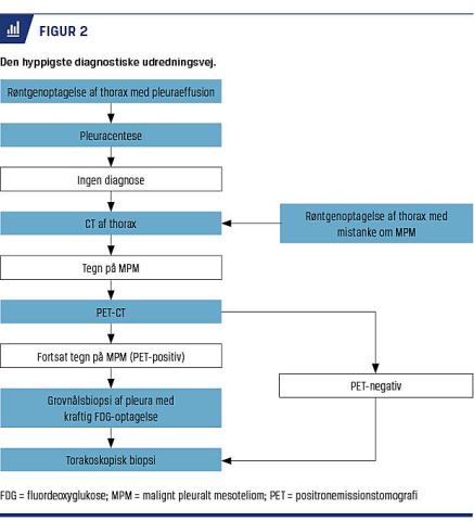 MPM er en diagnostisk udfordring pga. de uspecifikke kliniske tegn samt den lange latenstid, og fordi det er svært at skelne fra benigne pleurale og pulmonale tilstande. Figur 2 viser den hyppigste udredningsmåde.
