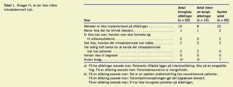 På spørgsmålet om, hvorvidt der måltes IAP på afdelingen, svarede man på ni KA og 28 ITA bekræftende. På 17 ITA angav man, at der måltes IAP på 3-110 patienter pr. år og tilsvarende på 5-50 patienter pr. år på seks KA. De afdelinger, hvor man ikke målte IAP, blev spurgt, hvorfor de ikke målte IAP. Svarene kan ses i Tabel 1.