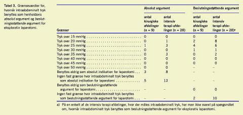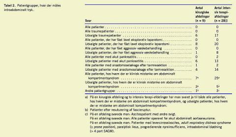 Resultater: 81% af de adspurgte afdelinger besvarede spørgeskemaet. På 74% af ITA og 31% af KA målte man IAP. 100% brugte blæretryksmåling som målemetode. De internationale retningslinjer blev fulgt af 11% af KA og 18% af ITA, mht. hvor ofte intraabdominalt tryk (IAP) blev målt og 44%/32% mht. ved hvilket IAP-niveau kirurgisk intervention skal overvejes. På 78% af de KA og 79% af de ITA, hvor man målte IAP, havde man eksplorativ laparotomi som behandlingsmulighed. Der var både blandt KA og ITA store forskelle med hensyn til, hvilke patientgrupper der fik målt IAP.