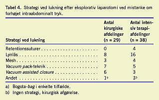 På spørgsmålet om, hvilken lukkestrategi der anvendtes efter eksplorativ laparotomi på mistanke om forhøjet intra-abdominalt tryk, var der ingen umiddelbar tendens. Dette stemmer overens med, at der internationalt ikke findes retningslinjer.
