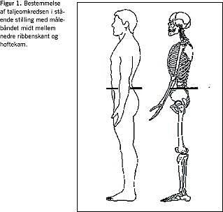 Kropsvægt og talje- og hofteomkreds bør bestemmes om morgenen, helst fastende og efter at vandet er ladt. Kropsvægten bestemmes ved at personen iført let beklædning og uden sko står på vægten til denne har stabiliseret sig til nærmeste 0,1 kg. Legemshøjden bestemmes ved at personen uden sko står stille med ryggen mod det centimeterinddelte mål, indtil nærmeste 0,1 cm kan fastslås. Inden bestemmelse af talje- og hofteomkredsen skal personen have løsnet livrem eller bælte. Taljeomkredsen bestemmes i stående stilling ved at anbringe målebåndet midt mellem nedre ribbenskant og hoftekam (Figur 1 ). Taljeomkredsen registreres til nærmeste hele cm efter at personen i afslappet tilstand har foretaget en eksspiration. Hofteomkredsen bestemmes ligeledes i stående stilling svarende til hofternes største omkreds. Ved bestemmelse af såvel kropsvægten, legemsvægten, talje- og hofteomkredsen foretages tre målinger, hvorefter gennemsnittet noteres.