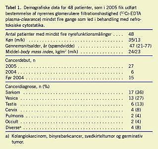 Materiale og metoder: Opgørelsen omfatter alle patienter, som i 2005 havde fået bestemt GFR mindst fire gange som led i behandling med nefrotoksiske cytostatika. Den estimerede GFR (eGFR) blev beregnet ud fra patientens alder, køn og vægt ad modum Cockroft.
