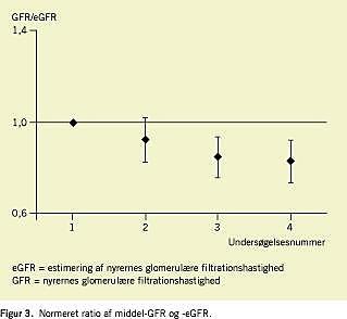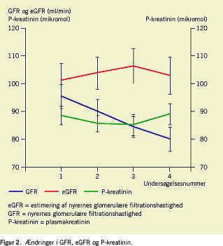 Figur 2 viser udviklingen i GFR, plasmakreatinin og eGFR fra første til fjerde måling. Middel-GFR faldt forholdsmæssigt over tid, mens plasmakreatinin faldt initialt for at stige lidt ved fjerde måling. Der var dermed ingen signifikant forskel mellem første og fjerde måling. Svarende til udviklingen i plasmakreatinin ses et spejlvendt forløb af eGFR med initial stigning efterfulgt af et fald ved fjerde måling, hvilket er udtryk for, at udviklingen i eGFR alene afspejles ved ændringer i plasmakreatinin, idet vægten ikke ændrede sig.
