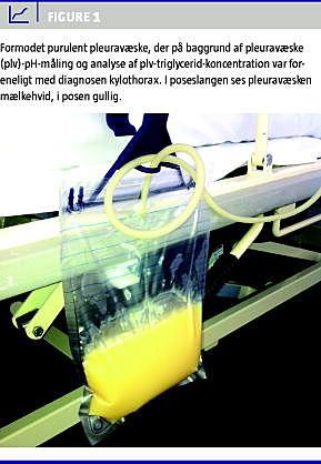 En 79-årig kvinde med ovariecancer blev undersøgt pga. pleuraeffusion. Ved torakocentese blev der udtømt strågul pleuravæske, som på baggrund af Lightskriterierne var foreneligt med pleuraekssudat [3]. Pleuravæsken var uden vækst af bakterier eller svampe, men ved en cytologisk undersøgelse blev der påvist pleurametastasering af patientens ovariecancer. Da man ved et senere recidiv udtømte tydeligt gulhvid pleuravæske med højere viskositet end tidligere, opstod der mistanke om empyem (Figur 1 ). Diagnosen blev understøttet af parakliniske fund i form af stigende C-reaktivt protein, tiltagende neutrofil leukocytose og nytilkomne infiltrative forandringer, der sås på røntgenoptagelser af thorax. Herpå iværksattes antibiotisk behandling med intravenøst givet cefuroxim og metronidazol, pleuradrænage og intrapleural skylning med isotonisk NaCl. På trods af empyemmistanken blev der på centrallaboratoriet efterfølgende udført plv-pH-måling, der viste en værdi på 7,3, hvilket sammenholdt med plv-leukocytter på 80 × 10 6 /l medførte, at man fandt empyem mindre sandsynligt og i stedet overvejede diagnosen kylothorax. En supplerende analyse for koncentrationen af plv-triglycerid på 7,4 mmol/l bekræftede denne diagnose. Drænet blev seponeret, og der blev givet antibiotikaterapi rettet mod pneumoni. Senere dyrkningssvar af pleuravæsken viste ingen vækst.