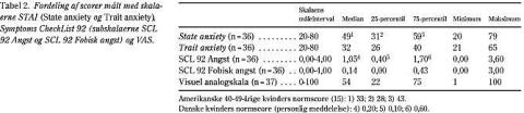 I udenlandske anæstesiologiske undersøgelser har det været almindeligt at anvende State Trait Anxiety Inventory (STAI) til måling af præoperativ angst (7, 8, 11-17). Denne skala har ligeledes været anvendt i enkelte danske undersøgelser (9, 10, 18). Andre danske undersøgelser har benyttet en visuel analog skala (VAS) (5, 6). Ingen af disse skalaer er dog valideret på en dansk population, hvorimod en anden kendt multidimensional skala Symptoms CheckList 92 (SCL 92) for nylig er blevet valideret i et dansk materiale (personlig meddelelse).