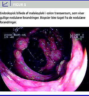 Malakoplaki (MP) er en sjælden granulomatøs inflammatorisk sygdom, som først blev beskrevet i 1901 [1]. Sygdommen er karakteriseret patologisk ved ophobning af histiocytter, kaldet von Hansemanns celler (vHC)), der indeholder patognomoniske intracytoplasmatiske inklusionslegemer, såkaldte Michaelis-Gutmann legemer (MGL) [1, 2]. Ætiologien til granulomdannelsen og inklusionslegemerne formodes at være persisterende intracellulær bakteriel infektion på grund af nedsat fagocytfunktion og defekt drab af intracellulære bakterier i vHC [1, 2]. MP forekommer langt hyppigst i urinvejene, dog er mave-tarm-kanalen nævnt som næsthyppigste lokalisation [2, 3].