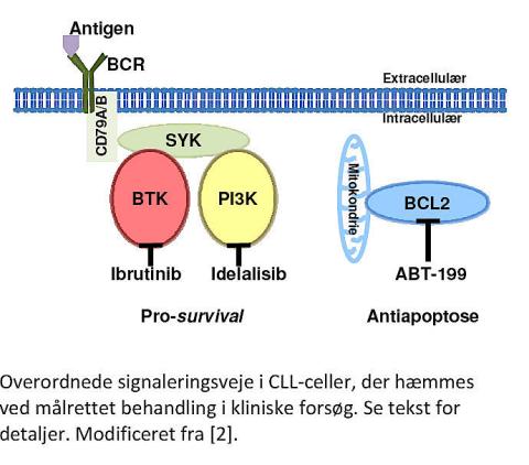 BCR-hæmmere: Mange forskellige B-lymfoproliferative sygdomsenheder er afhængige af BCR-signaleringsvejen [1]. Dette har ført til præklinisk og klinisk afprøvning af medikamenter, der kan blokere forskellige kinaser i denne signaleringsvej. Specielt to medikamenter, BTK-hæmmeren ibrutinib og PI3K-hæmmeren idelalisib (se figuren), har vist meget lovende resultater i kliniske forsøg for patienter med bl.a. CLL, Waldenströms makroglobulinæmi, mantle-cellelymfom, til dels follikulære lymfomer samt ABC-subtypen af diffust storcellet B-cellelymfom. For patienter med CLL er der vist progressionsfri overlevelse > 2 år for > 75% af tidligere behandlede patienter og > 96% for behandlingsnaive patienter [3]. Selvom kun et fåtal af patienterne opnår komplet remission efter måneders behandling, opnår langt de fleste patienter en meget betydende reduktion af lymfeknudesvulst inden for de første måneder. Samtidig ses en redistribution of lymfocytter fra lymfeknuder til blodet. Denne lymfocytose, der først svinder over måneder til år, er ikke forbundet med dårligere prognose, idet det åbenbart er afgørende at få de maligne celler ud af det begunstigende mikromiljø i lymfeknuder og knoglemarv. Bivirkninger er håndterbare, primært grad 1-2-diarré og luftvejsinfektioner. Kombination med monoklonale antistoffer rettet mod CD20 mindsker lymfocytosen, men det er usikkert, om der i øvrigt er nogen synergisme mellem de to lægemidler.