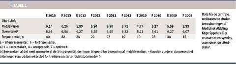 Medicinsk Afdeling, Køge Sygehus, er i øjeblikket den tredjebedst evaluerede afdeling af 38 afdelinger i Østdanmark, og vi har set en stigende tilfredshed med afdelingen som uddannelsessted bedømt på de skriftlige evalueringer (Tabel 1). Vi har den højeste svarprocent på evalueringerne og har for tiden næstflest studerende på klinisk kursus i intern medicin II blandt alle afdelinger i Østdanmark.