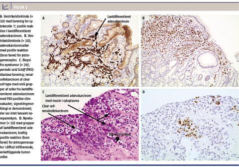 Man vurderede, at der ikke var kirurgiske behandlingstilbud til patienten. Hun blev tilbagehenvist med henblik på onkologisk behandling af nyre- og ventrikelcancer, hvorfor nyretumoren blev biopteret. Histologien viste renalcellekarcinom af clear cell-type (ccRCC) med typisk vækstmåde og glykogenholdige tumorceller (Figur 1C og Figur 1D). Der var desuden små mucinholdige cellegrupper i nyretumoren med kraftig positiv reaktion for CK7 (Figur 1C). Da man fandt det bemærkelsesværdigt, at der var konstateret tre cancertyper hos patienten, foretog man yderligere farvninger på både nyre- og ventrikelbiopsierne, hvor tumorvævet i begge lokalisationer viste positiv reaktion for østrogenreceptor- (Figur 1B og Figur 1D) og mammamarkøren gross cystic disease fluid protein og negativ reaktion for mammaglobin og anti-paired box gene 8. Således var der tale om ccRCC med tumor til tumor-metastase fra et mammakarcinom i nyren og metastase fra et mammakarcinom i ventriklen.