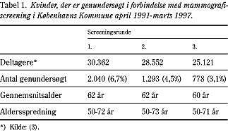 Fra april 1991 til marts 1997 blev der afviklet tre mammografiscreeningsrunder i Københavns Kommune. Screeningsmetoden og de demografiske oplysninger er tidligere publiceret (3).