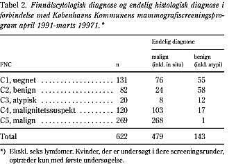 Cytologi klassificeres i fem kategorier C1-C5 (Tabel 2). Histologi baseres på fire kategorier: benign, atypisk, carcinoma in situ og invasivt karcinom. I tilfælde af udredningsforløb med flere FNC'er baseres beregningerne på den mest maligne FNC-diagnose. Diagnosen på de finnålscytologiske undersøgelser blev ved de malignitetssuspekte og maligne FNC'er klassificeret som falsk positive (FP), når den endelige histologiske diagnose var benign eller atypisk, og sand positive (SP), når den endelige histologiske diagnose var malign, dvs. carcinoma in situ el ler invasivt karcinom. Uegnede, benigne og atypisk FNC'er blev klassificeret som falsk negative (FN), når den endelige histologiske diagnose var malign. Benigne FNC'er blev klassificeret som sand negative (SN), når den endelige histologiske diagnose var benign eller atypisk. Der blev alene anvendt oplysninger fra de patienter, for hvem der forelå både cytologi og histologi.